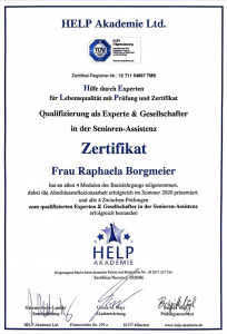 Zusätzlich habe ich in diesem Jahr (2020) die Qualifikation zur Expertin und Gesellschafterin  der Senioren-Assistenz bei der HELP-Akademie in München erworben. Die HELP-Akademie ist eine staatlich anerkannte und durch die Bundesregierung AZAV zertifizierte Bildungseinrichtung zur Ausbildung von Berufsbetreuern und Senioren-Assistenten. Die Ausbildung folgt den höchsten ethischen Werten und Normen.